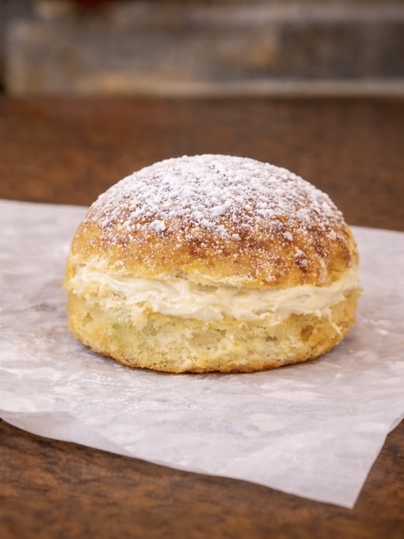 Uma bola de manteiga de tamanho normal, feita artesanalmente, com massa fofa e creme suave – o sabor tradicional do Barreiro em cada dentada.